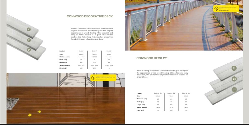 Conwood Deck adalah material penutup lantai outdoor berbasis fiber cement yang dirancang menyerupai tampilan dan tekstur kayu alami. Produk ini merupakan alternatif decking kayu yang ramah lingkungan, tahan air, tahan rayap, dan bebas perawatan rutin seperti pelapisan ulang.