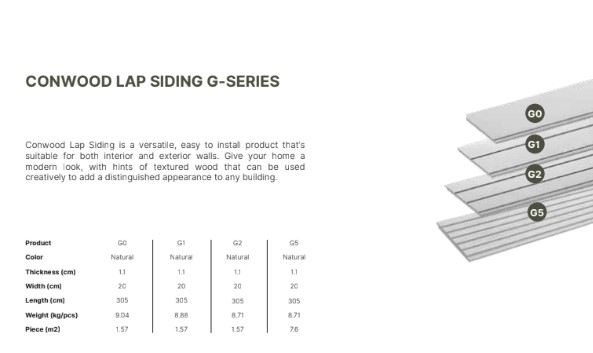 Conwood Siding G Series adalah panel siding berbahan dasar fiber cement yang menyerupai tekstur kayu alami. Siding ini biasanya digunakan untuk pelapis dinding bagian luar (fasad), namun juga bisa diterapkan pada interior untuk menghadirkan aksen kayu yang estetik.